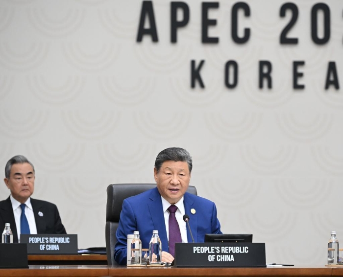 Chinese President Xi Jinping attends the second session of the 32nd APEC Economic Leaders' Meeting and delivers a speech titled "Jointly Forging a Sustainable and Brighter Future" in Gyeongju, South Korea, Nov. 1, 2025. (Xinhua/Xie Huanchi)