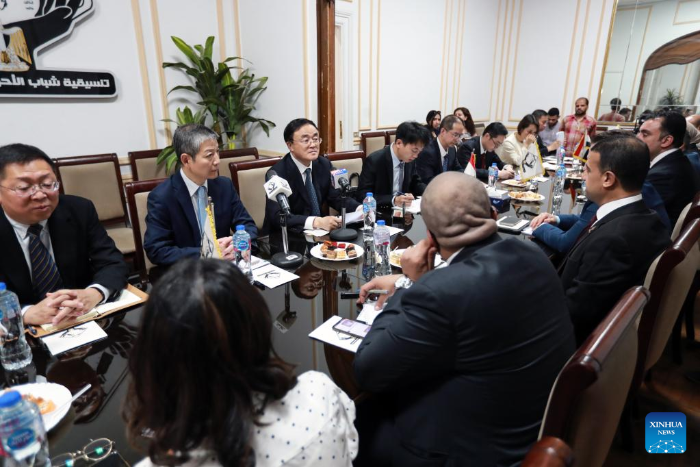Qu Qingshan (3rd L, back), a member of the Central Committee of the Communist Party of China (CPC) and head of the Institute of Party History and Literature of the CPC Central Committee, holds discussions with members of the Coordination Committee of Party's Youth Leaders and Politicians in Cairo, Egypt, June 4, 2023.