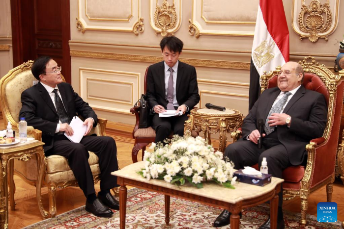 Qu Qingshan (L), a member of the Central Committee of the Communist Party of China (CPC) and head of the Institute of Party History and Literature of the CPC Central Committee, meets with Speaker of the Egyptian Senate and Chairman of Nation's Future Party Abdel-Wahab Abdel-Razeq in Cairo, Egypt, June 5, 2023.