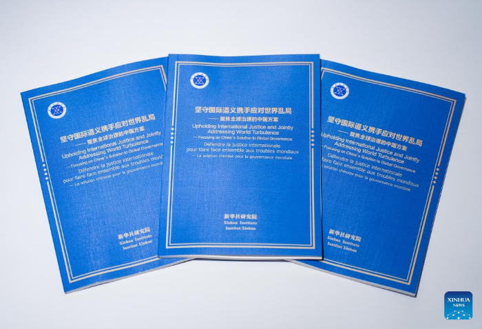 This photo shows copies of the think tank report titled "Upholding International Justice and Jointly Addressing World Turbulence -- Focusing on China's Solution to Global Governance." The Xinhua Institute, a think tank affiliated with Xinhua News Agency, on Tuesday released a report titled "Upholding International Justice and Jointly Addressing World Turbulence -- Focusing on China's Solution to Global Governance" at the Palais des Nations in Geneva. (Xinhua/Shi Feng)